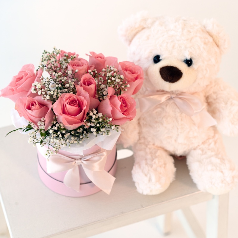 Õrn ja romantiline roosikarbi kingitus koos pehme kaisukaruga – ideaalne armsaks üllatuseks.